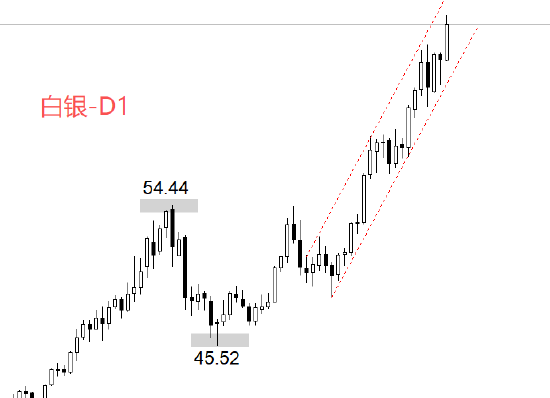 行情方面,日线级别 ,白银长期走势是明显的多头,期间很少出现幅度较大的回调走势 。在这种流畅的多头趋势下,抱有“涨多必跌”的看空的心态非常不可取。图中54.44美元是中期高点 ,45.52美元是中期低点,45.52之后的上涨走势,正在寻找新的中期高点。由于白银持续刷新历史更高点纪录 ,当前很难给出明确的上方阻力位或者阻力区间 。考虑到最新市价为65.88美元,可以按照整数关口的逻辑,将70美元看作中期高点可能出现的位置。
