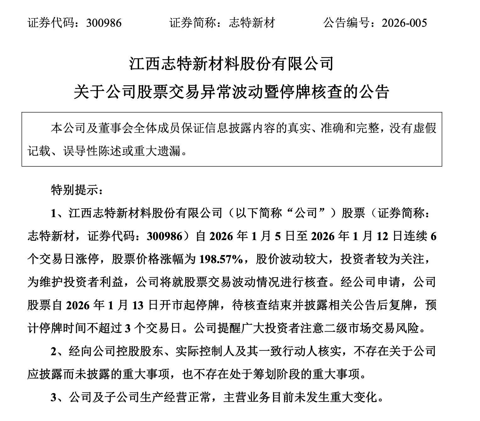 志特新材(300986.SZ)今日公告称 ,公司股票自2026年1月5日至1月12日连续6个交易日涨停,涨幅为198.57%,股价波动较大。为维护投资者利益 ,公司将就股票交易波动情况进行核查 。经申请,公司股票自1月13日开市起停牌,预计停牌时间不超过3个交易日。